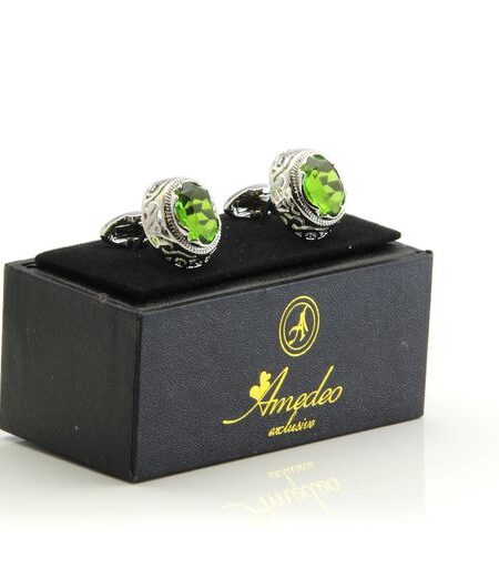Silver with Big Green Stone Mens Stainless Steel Round Cufflinks for Shirt with Box - Hand Crafted Perfect