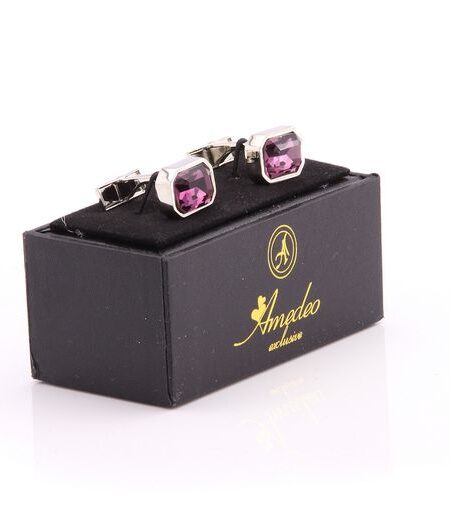Silver with Big Purple Stone Mens Stainless Steel Rectangular Cufflinks for Shirt with Box - Hand