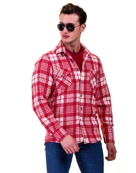 Red White Check Mens Slim Fit Designer Dress Shirt - tailored Cotton Shirts for Work and Casual Wear