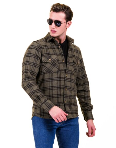 Olive Green Black Check Mens Slim Fit Designer Dress Shirt - tailored Cotton Shirts for Work and Casual Wear