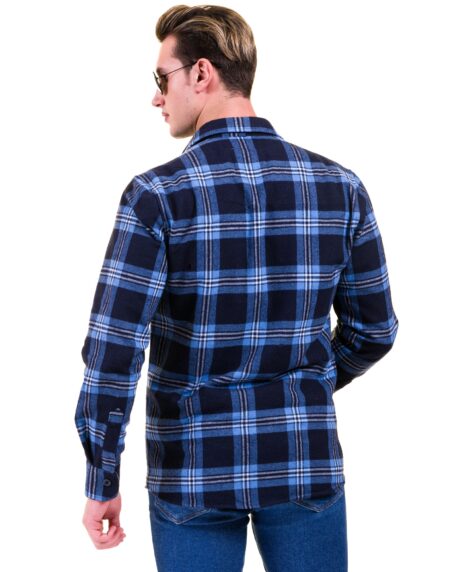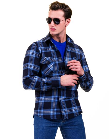Blue Black Check Mens Slim Fit Designer French Cuff Shirt - tailored Cotton Shirts for Work and Casual Wear