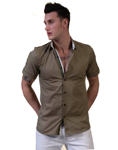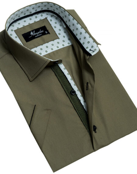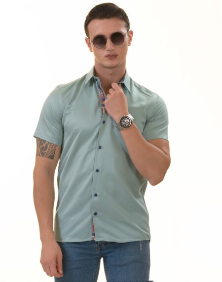 Green With White Mens Short Sleeve Button up Shirts - Tailored Slim Fit Cotton Dress Shirts
