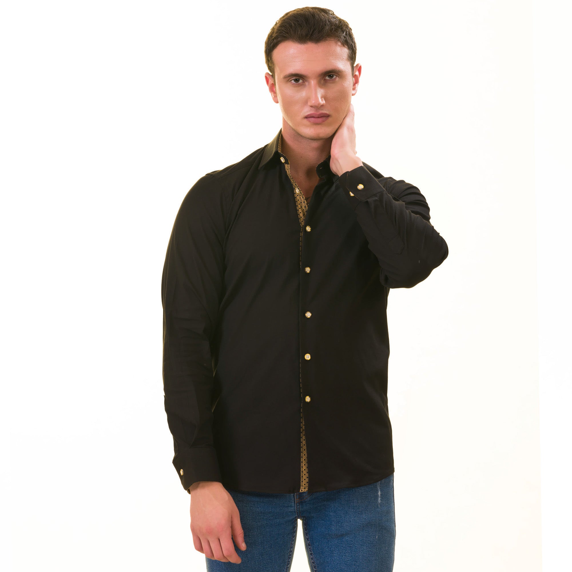 Amedeo Exclusive presents the Black Slim Fit Designer Dress Shirt for men, perfect for formal or casual wear. With this shirt, you get two looks in one, offering versatility and elegance for any occasion.