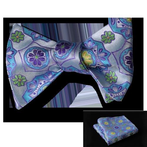 Blue and Yellow Floral Mens Silk Self tie Bow Tie with Pocket Squares Set