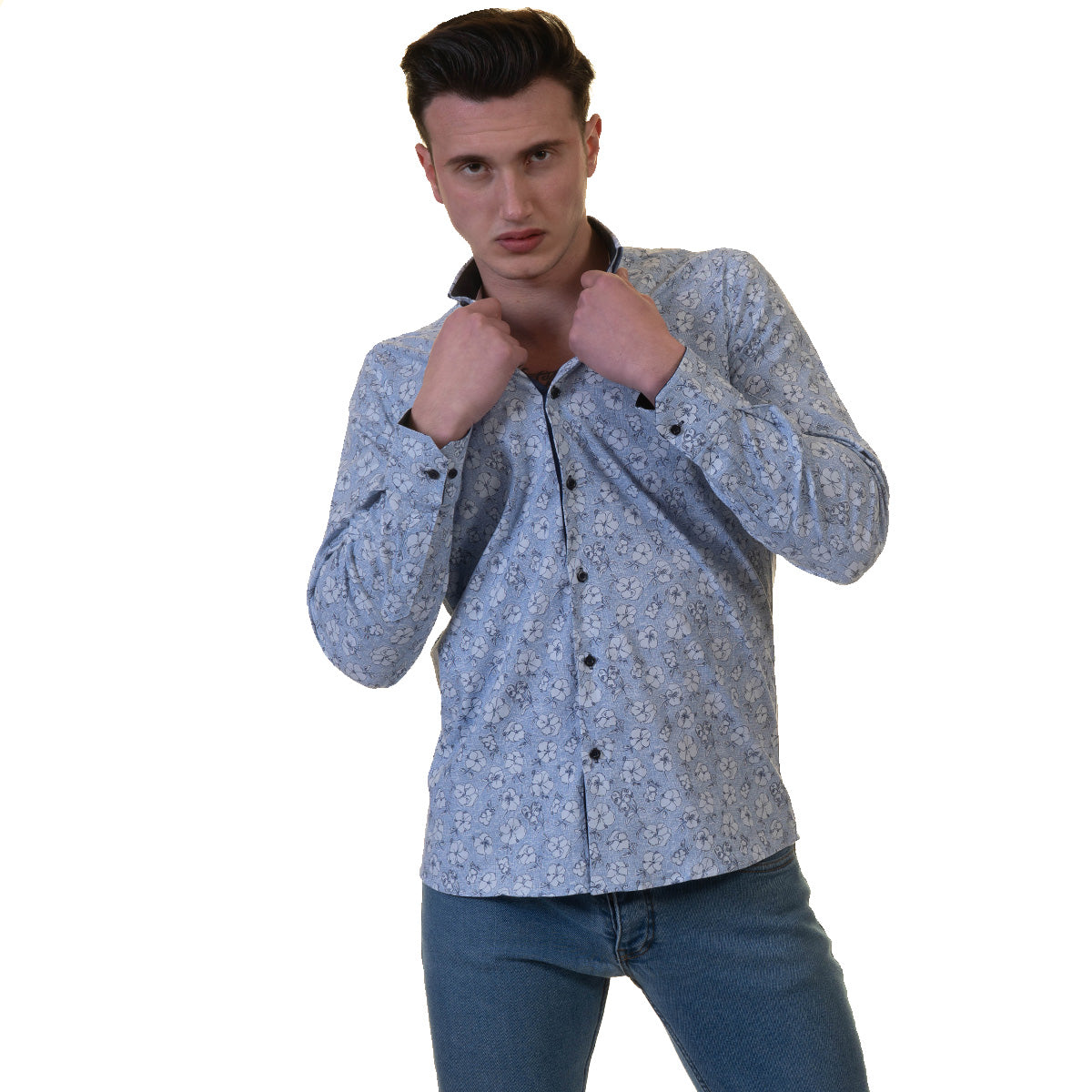 Blue Floral Mens Slim Fit Designer French Cuff Shirt – tailored Cotton Shirts for Work and Casual Wear