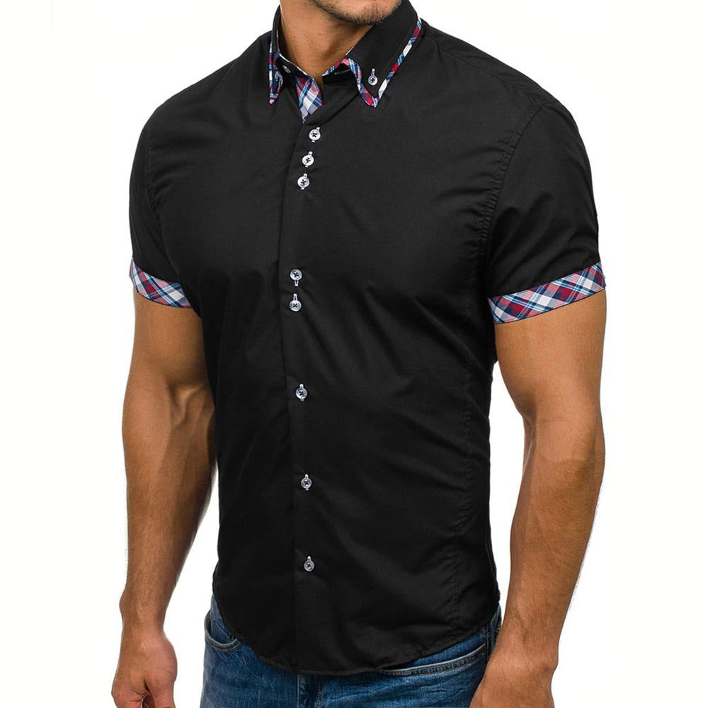 Men’s Button down Tailor Fit Soft 100% Cotton Short Sleeve Dress Shirt Black with Colorful Check casual And Formal