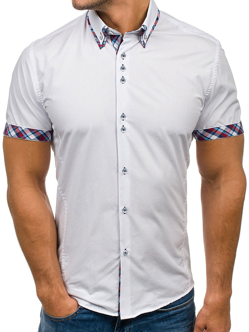 Men’s Button down Tailor Fit Soft 100% Cotton Short Sleeve Dress Shirt White with Colorful Checkcasual And Formal