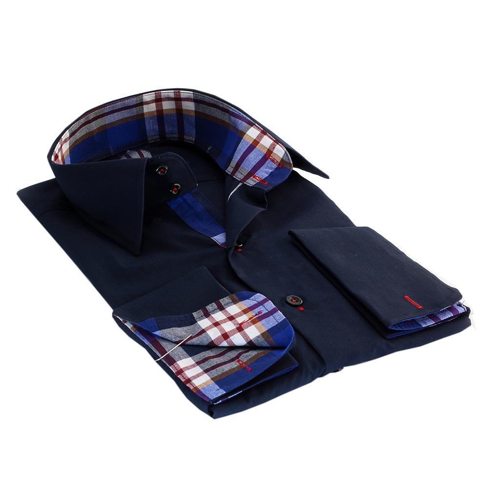 Navy Blue Red Check Mens Slim Fit French Cuff Shirts with Cufflink Holes – Casual and Formal