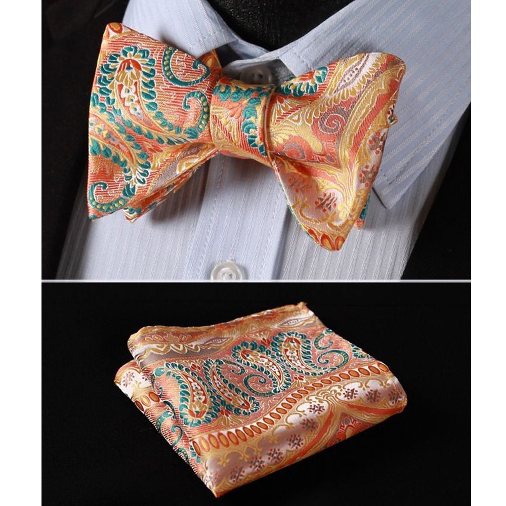 Orage Green Paisley Mens Silk Self tie Bow Tie with Pocket Squares Set