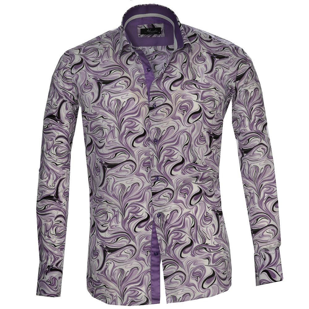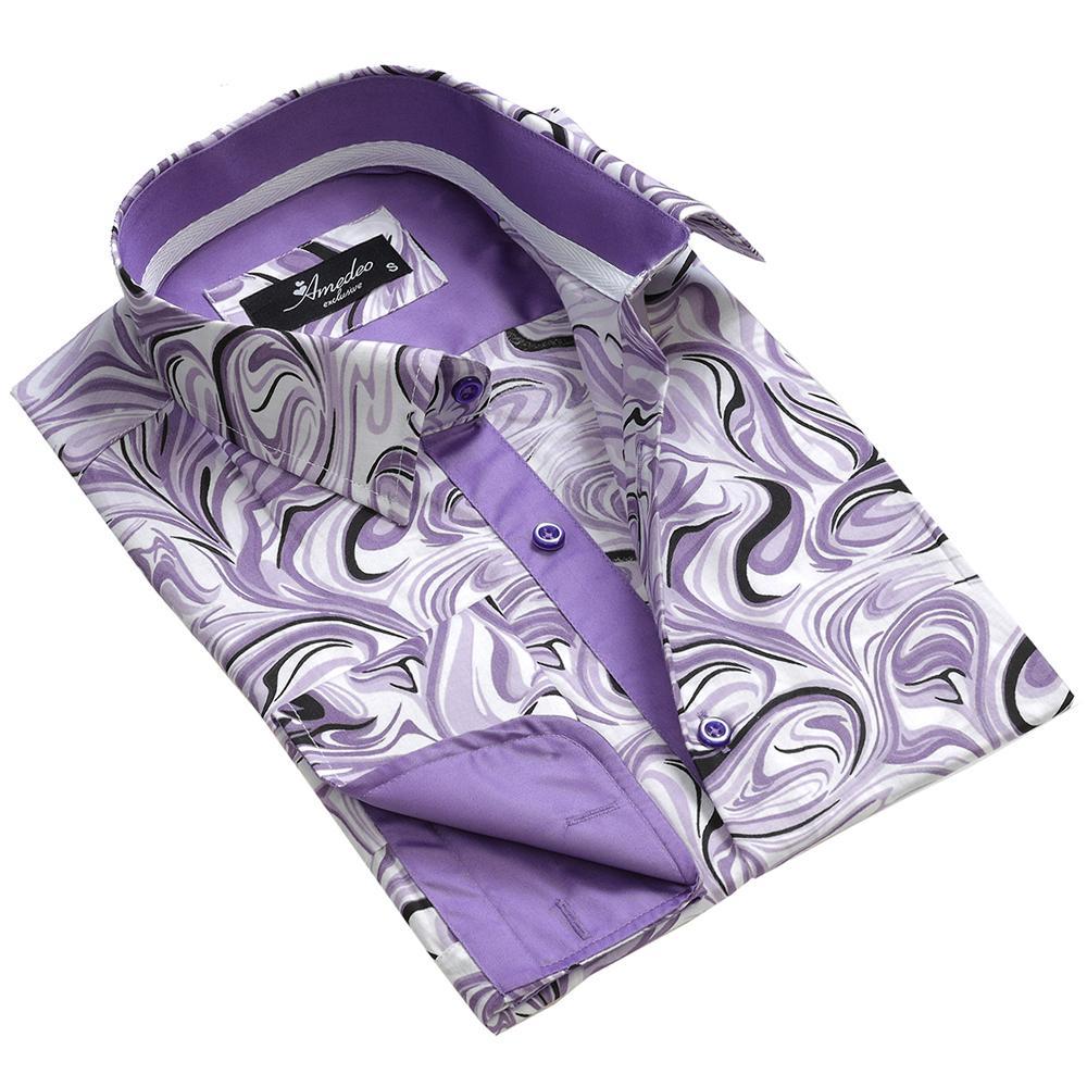 Purple White Swirls Mens Slim Fit French Cuff Shirts with Cufflink Holes – Casual and Formal