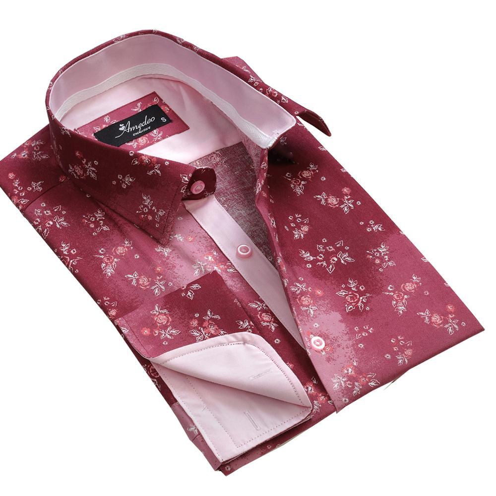Red Floral Sheen Mens Slim Fit French Cuff Shirts with Cufflink Holes – Casual and Formal