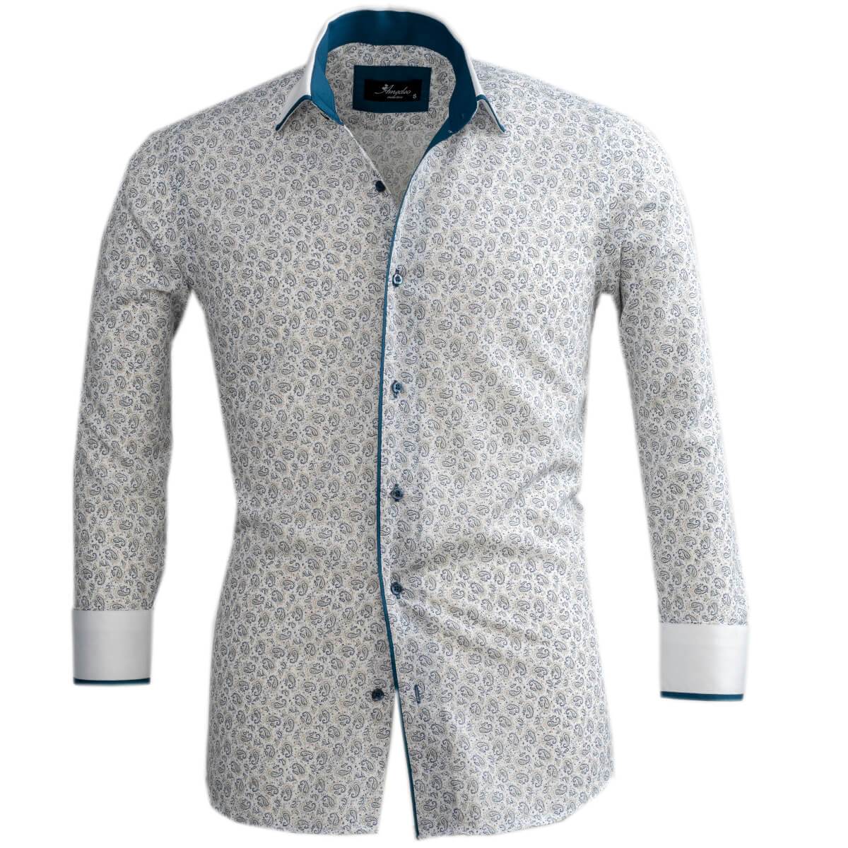 White Blue Paisley Mens Slim Fit Designer Dress Shirt – tailored Cotton Shirts for Work and Casual