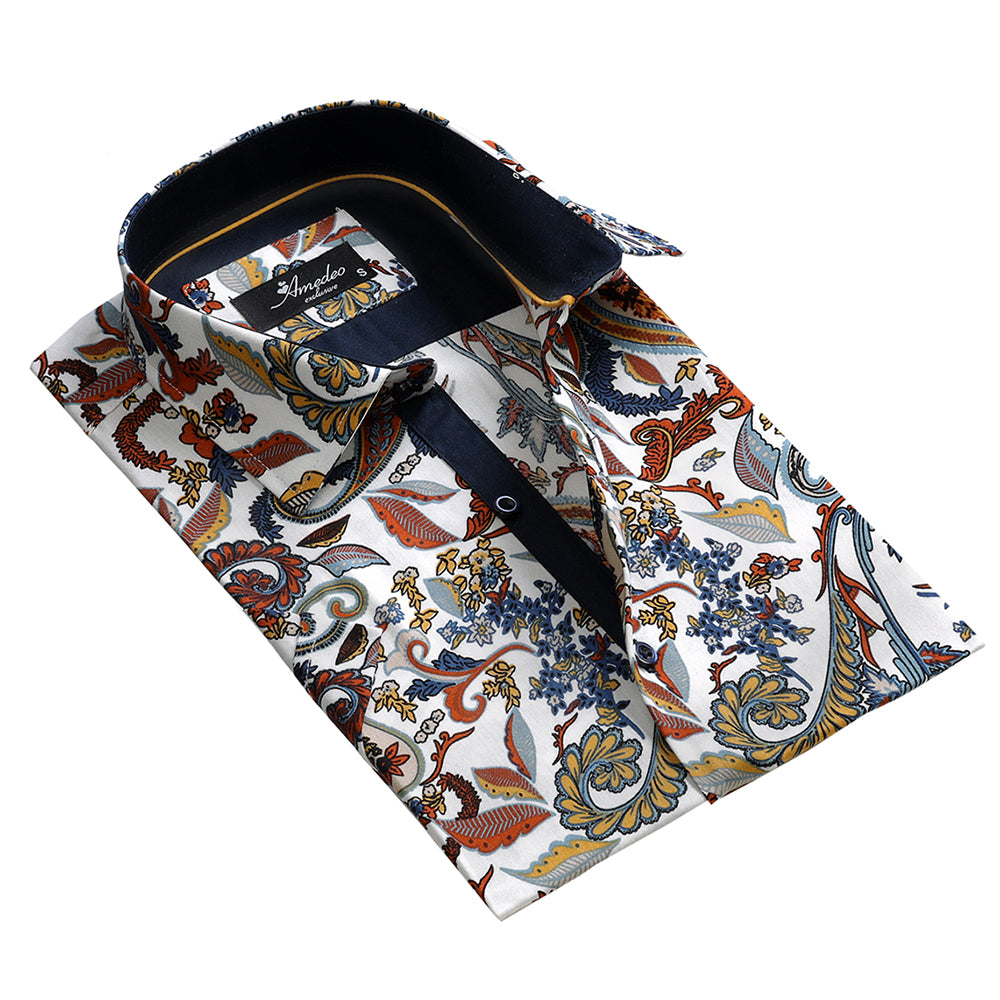 White with Colorful Floral Mens Short Sleeve Button up Shirts – Tailored Slim Fit Cotton Dress
